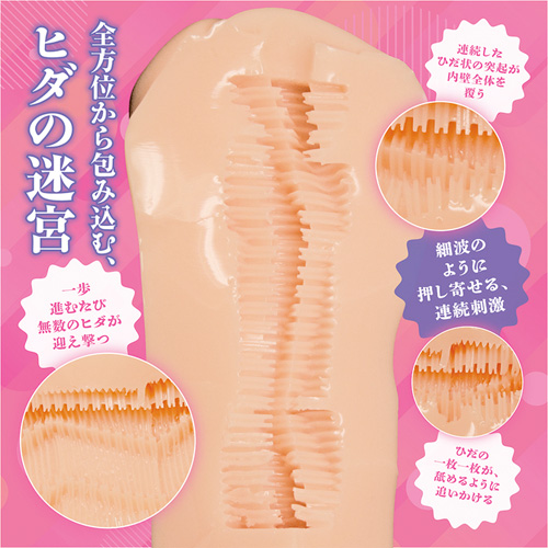 内部はトルネードっぽく配置された連続ヒダ構造。ウネりながら奥へと引き込まれる狭穴仕様で、この細かなヒダが大きな特徴。三角ヒダ二枚一組で構成され、突端の角ヒダが強めなジョリ感で擦り上げ、プラス後引くような絡みつきもある、この刺激の連続が射精感を高めるホールになってます!