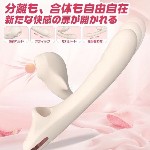 その日のオナ気分によってスタイルを変化できるトランスフォーム型バイブで、バイブ本体とサブバイブ部分が分離できる設計になっていて、それぞれ単体の一本型バイブやクリ吸引マシンとして使え、もちろん合体させて同時2点責めバイブとしても機能させることができます。