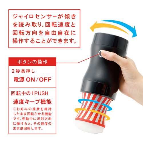 オナカップを「回転」させることで新しい刺激を楽しめる「TENGA GYRO ROLLER ジャイロローラー」というコントローラー専用のカップホールで、このコントローラーは傾きや角度に反応して作動する設計で、このアクションにマッチさせたのが、このカップホールです!